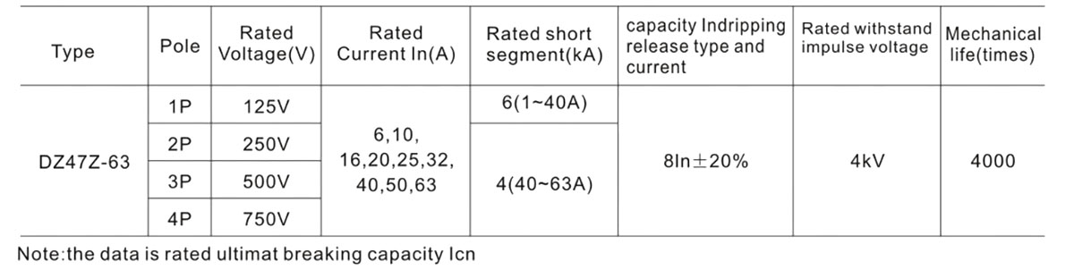 เบรกเกอร์ขนาดเล็กของ DZ47Z Series ได้รับการออกแบบมาเพื่อปกป้องวงจร DC ด้วยแรงดันไฟฟ้าที่จัดอันดับ 750V และกระแสไฟฟ้าที่ได้รับการจัดอันดับ 63A หรือน้อยกว่าจากโอเวอร์โหลดและวงจรลัดวงจรในสายไฟและอุปกรณ์ไฟฟ้า นอกจากนี้ยังสามารถใช้สำหรับการสลับเส้นและอุปกรณ์เป็นครั้งคราวในสถานการณ์ปกติ